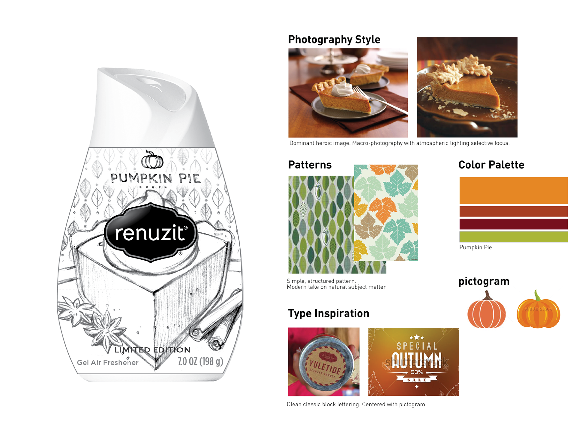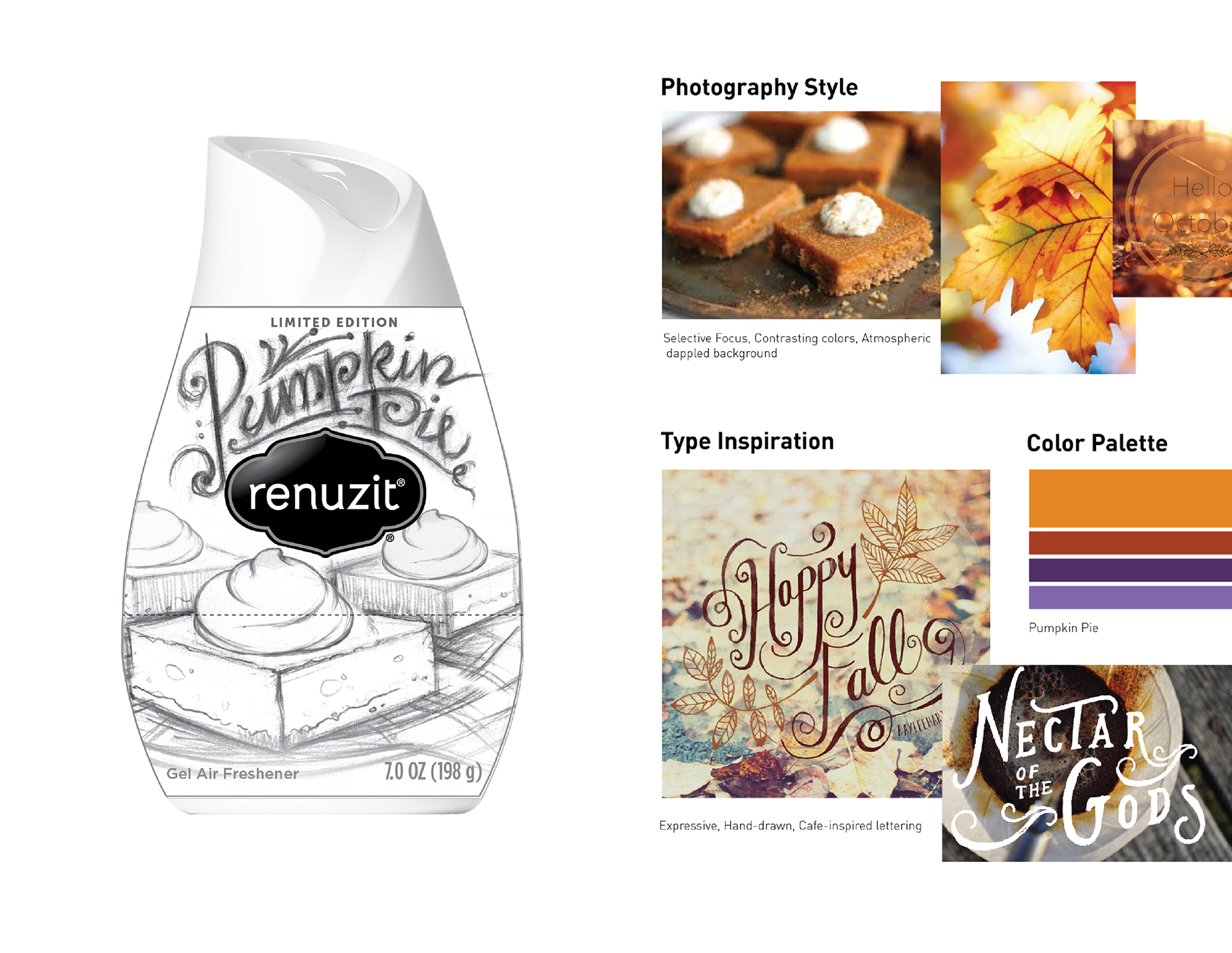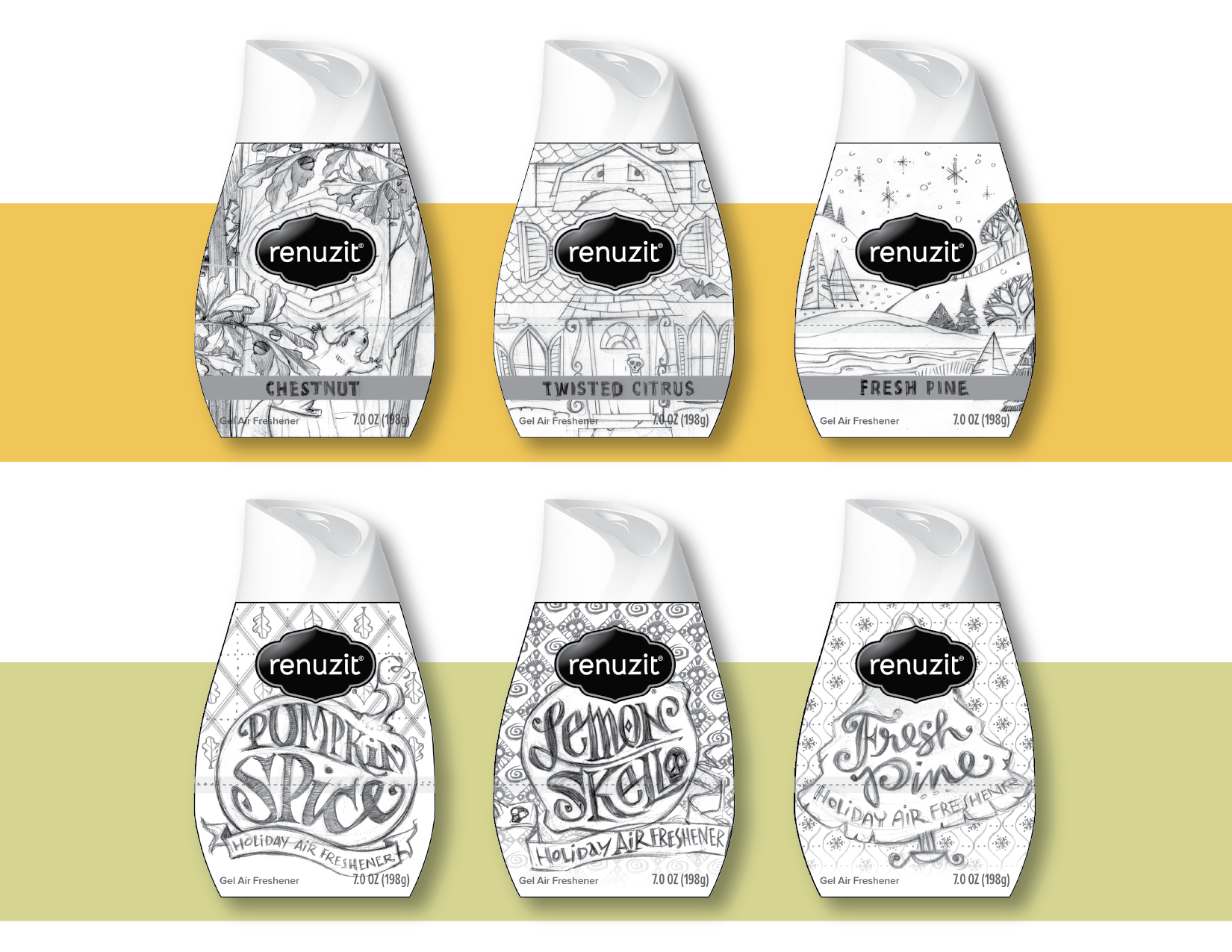 Graphic solution for Renuzit's fall 2015 air freshener cones. I was brought aboard by SpiceFire Design to brainstorm concepts and develop pencil layouts using cues provided by their in-house trend specialists. The sketches I provided were blueprints for SpiceFire's final designs.