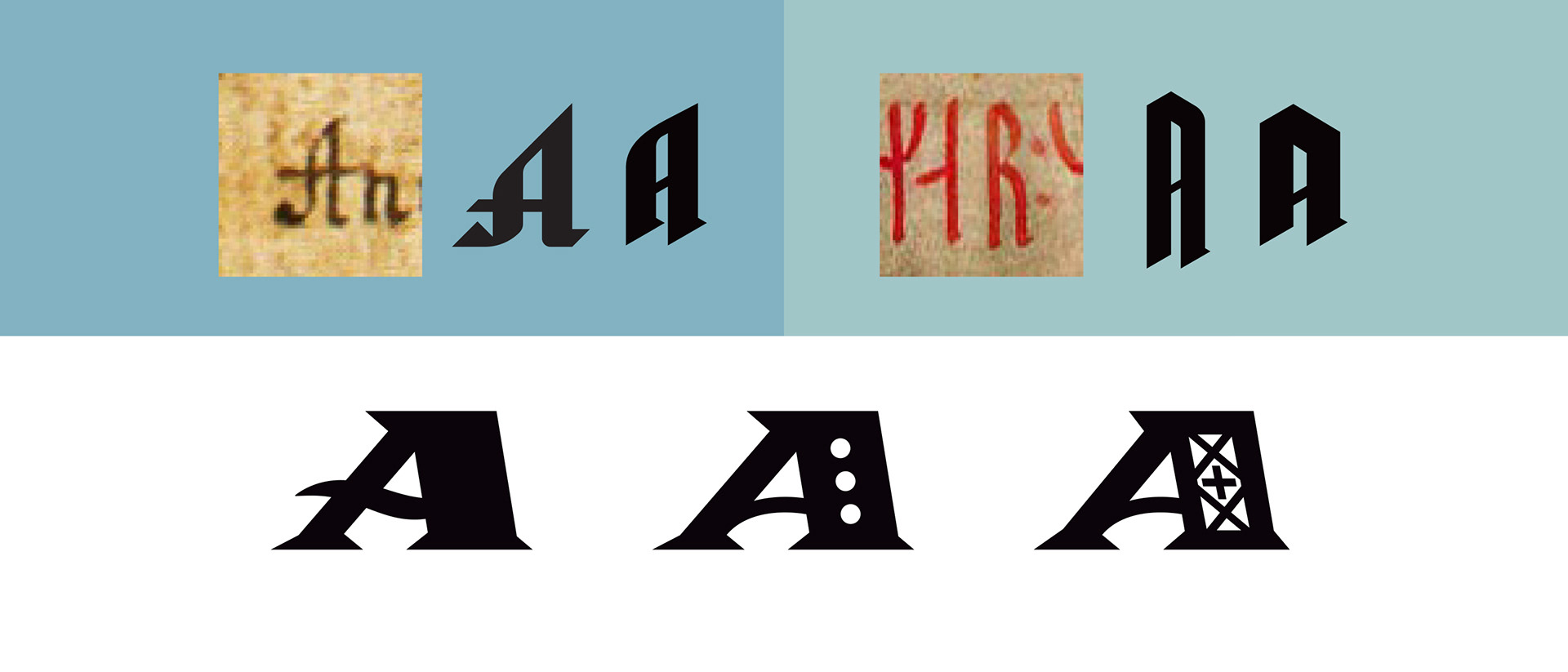 I settled on a contrasty Roman "A" with embellishents that referenced waves, rivets and Viking woodcraft.