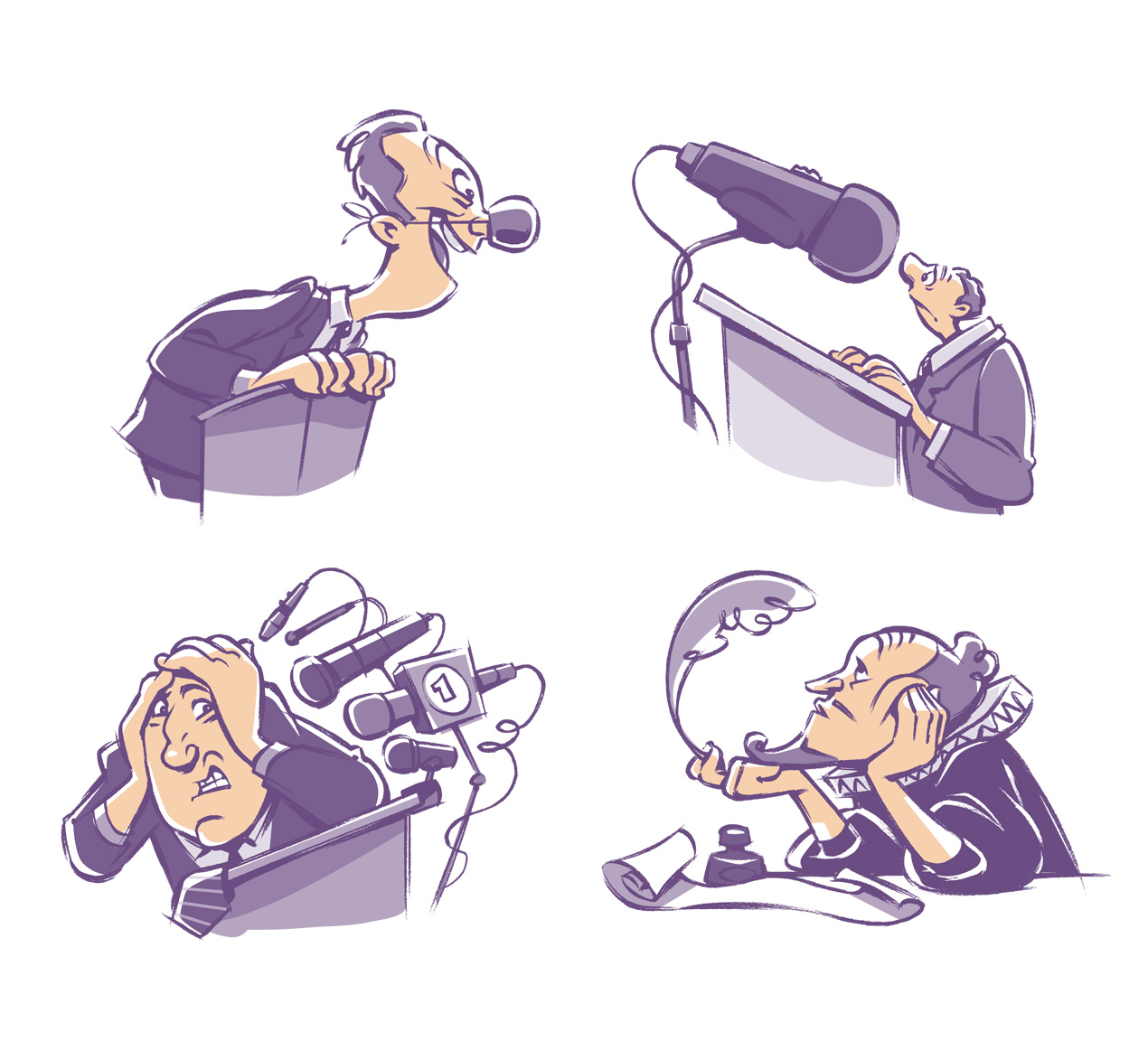 I created a multitude of spot Illustrations to liven up the text. Lots of variations on podium-speakers, with a smattering of historical figures who get quoted a lot.
