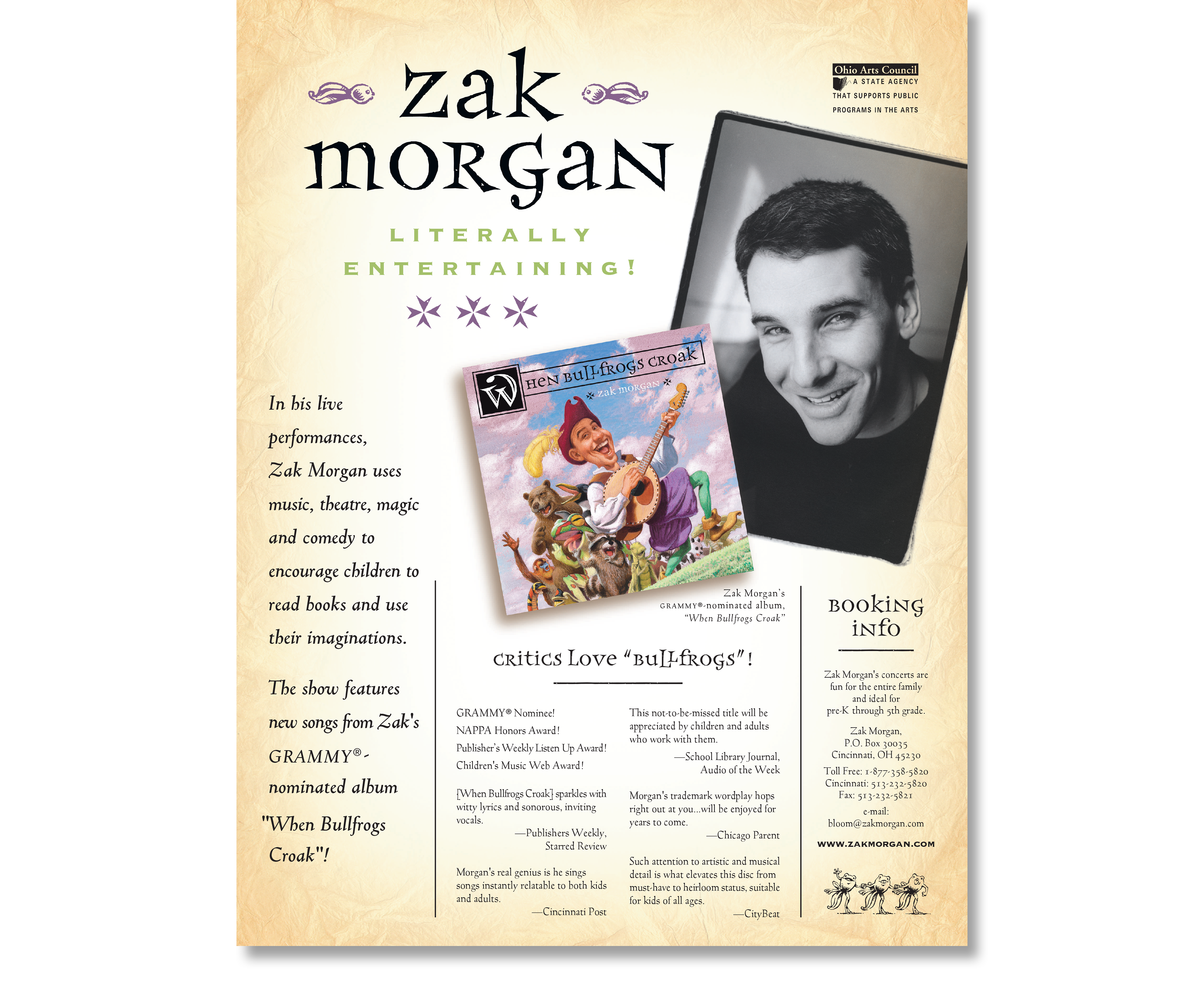 An elaborate CD package and booklet for Zak Morgan's GRAMMY-nominated album, "When Bullfrogs Croak".